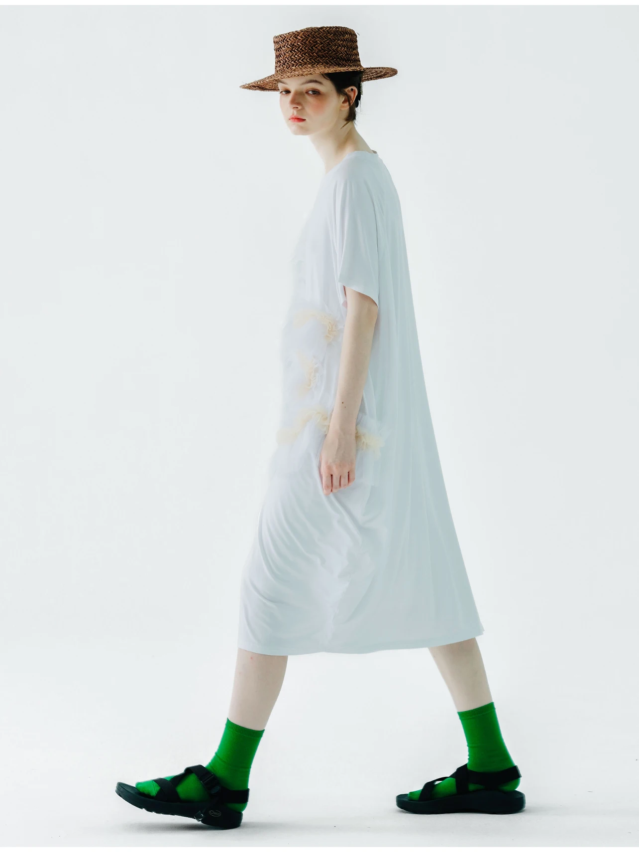 The dress is made of modal fabric, which is known for its softness, breathability, and drape. Modal is a type of rayon fabric derived from natural materials, such as beech trees, and it provides a smooth and luxurious feel against the skin. The modal fabric ensures comfort even in warm weather, allowing for airflow and preventing excessive sweating.