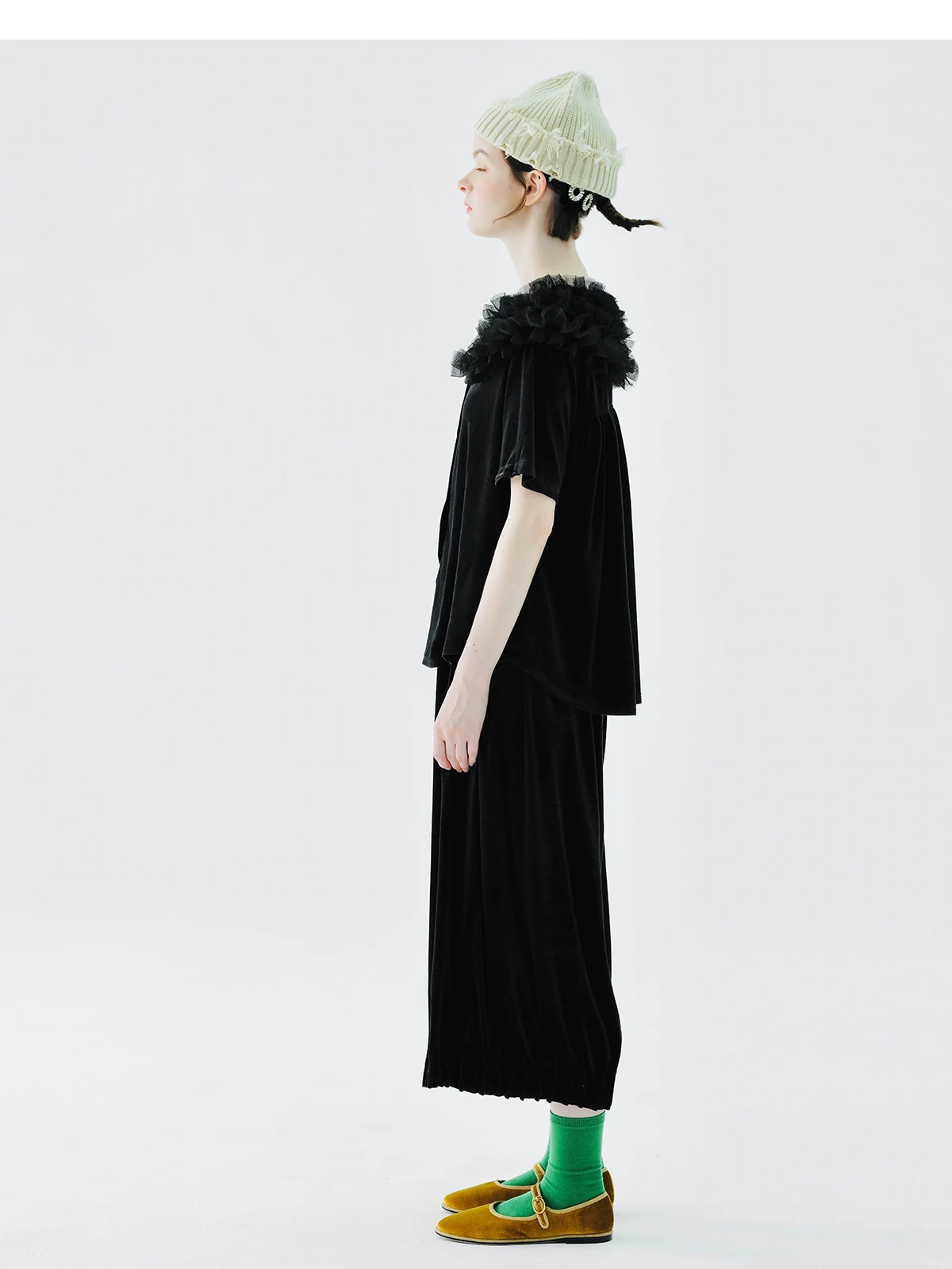 The Totokaelo Velvet Patchwork Collar Shirt is a unique and stylish short-sleeved shirt in a captivating black color. This shirt showcases a special design that sets it apart from traditional shirts.